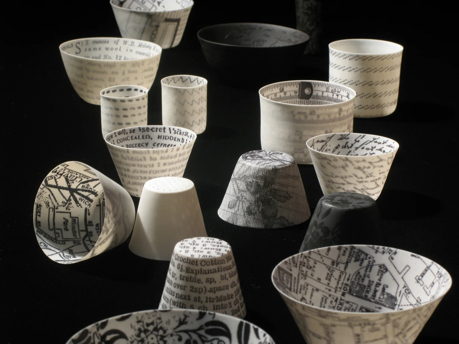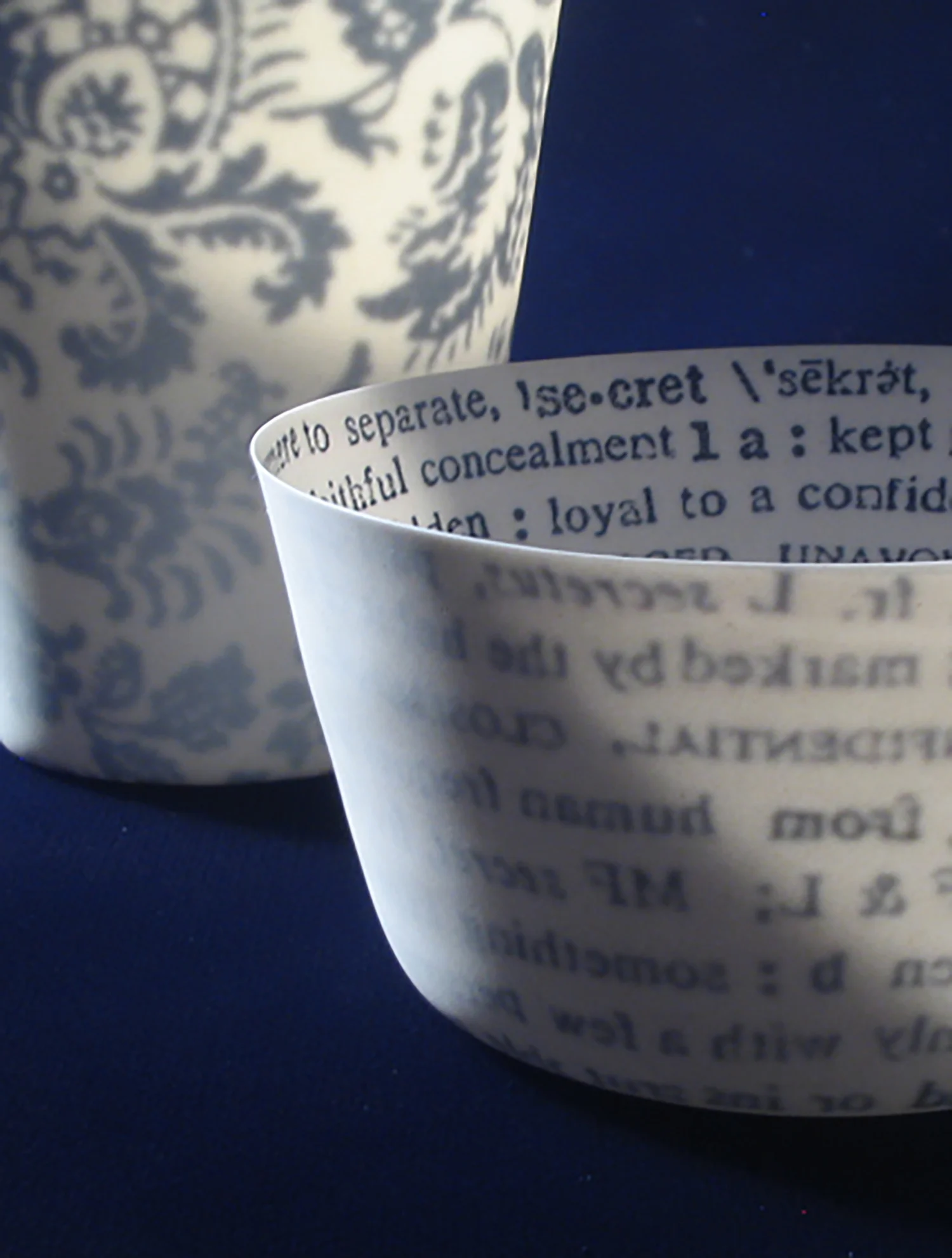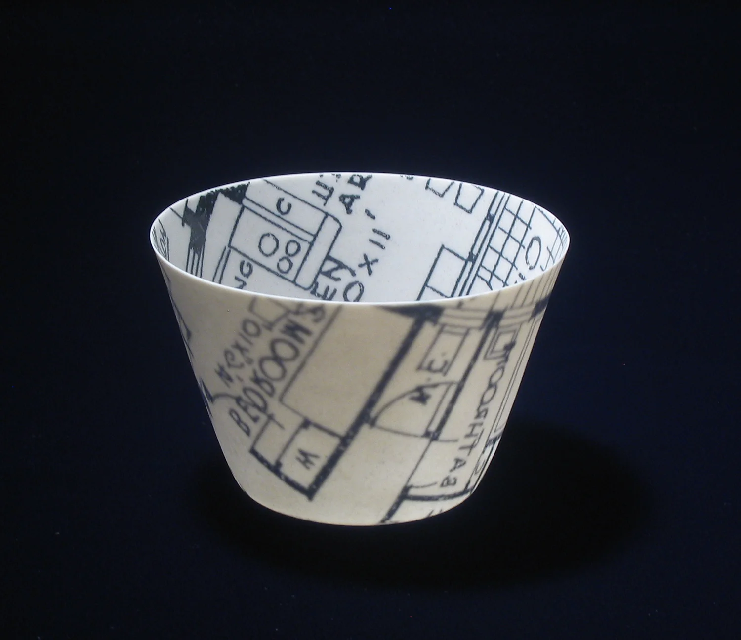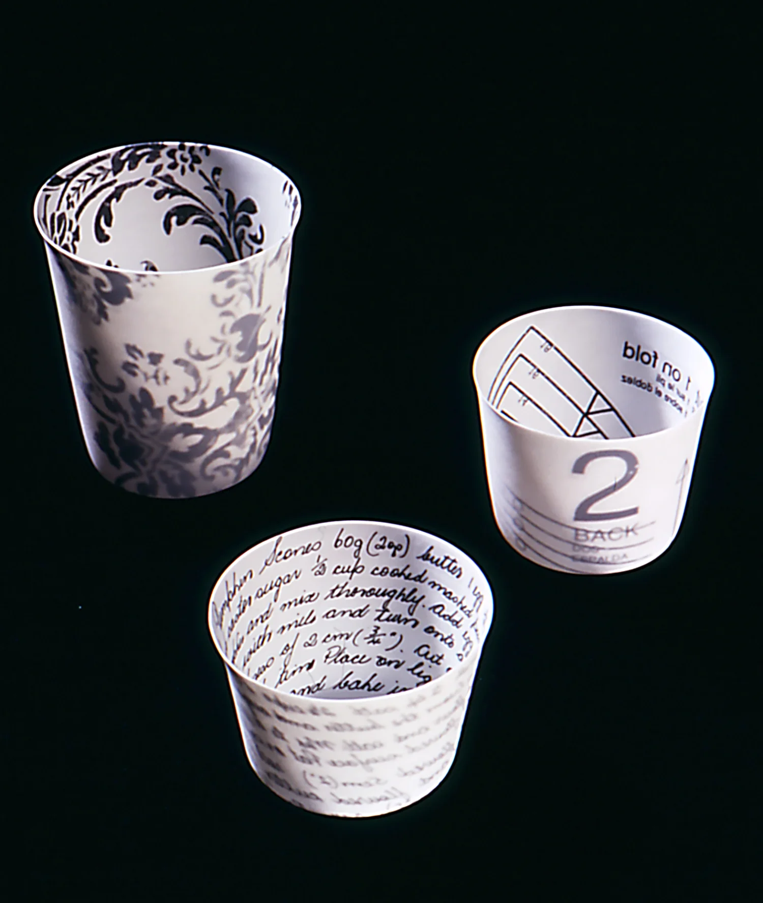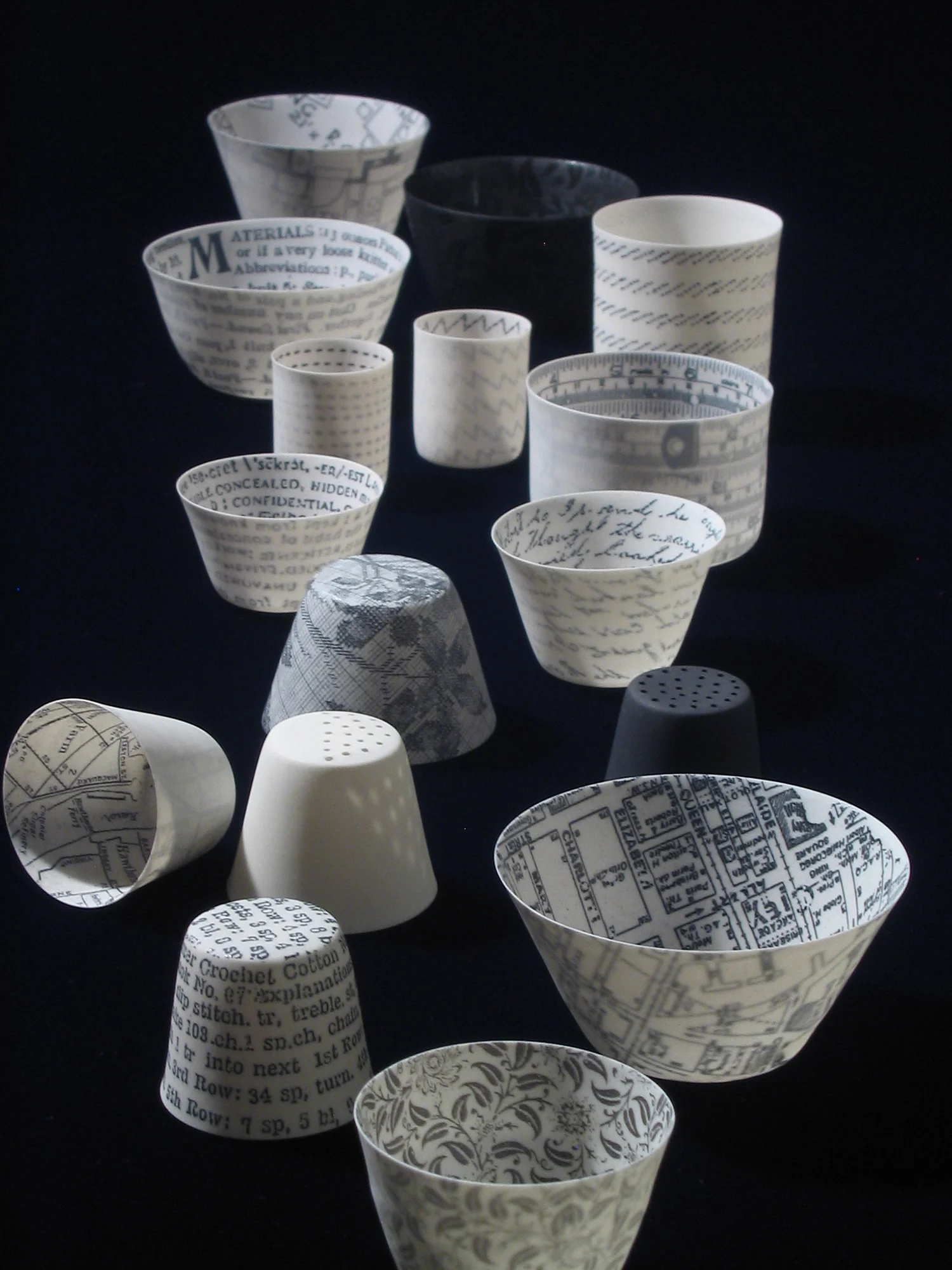 From 2005 until 2011 Mel Robson worked on a series of translucent porcelain works that evolved from an interest in the histories, stories and associations that can become embedded in everyday objects. They are responses to both her own past as well as the stories of a more collective history of the domestic. Imagery found in the domestic landscape such as old maps, family letters and diary excerpts, sewing patterns, recipes and photographs, are applied to the eggshell fine porcelain vessels. They reference the tenuous and fragile ways in which we can connect with the past and how we might discover and assemble meaning through objects.