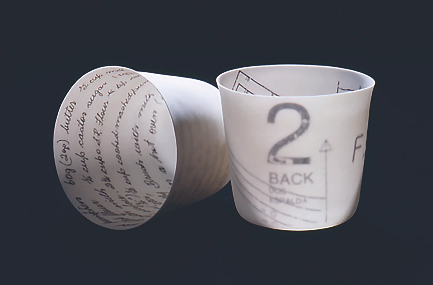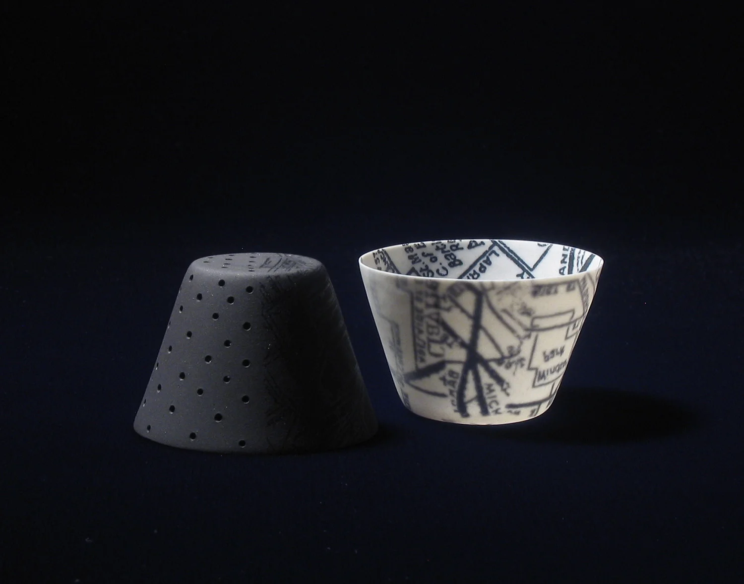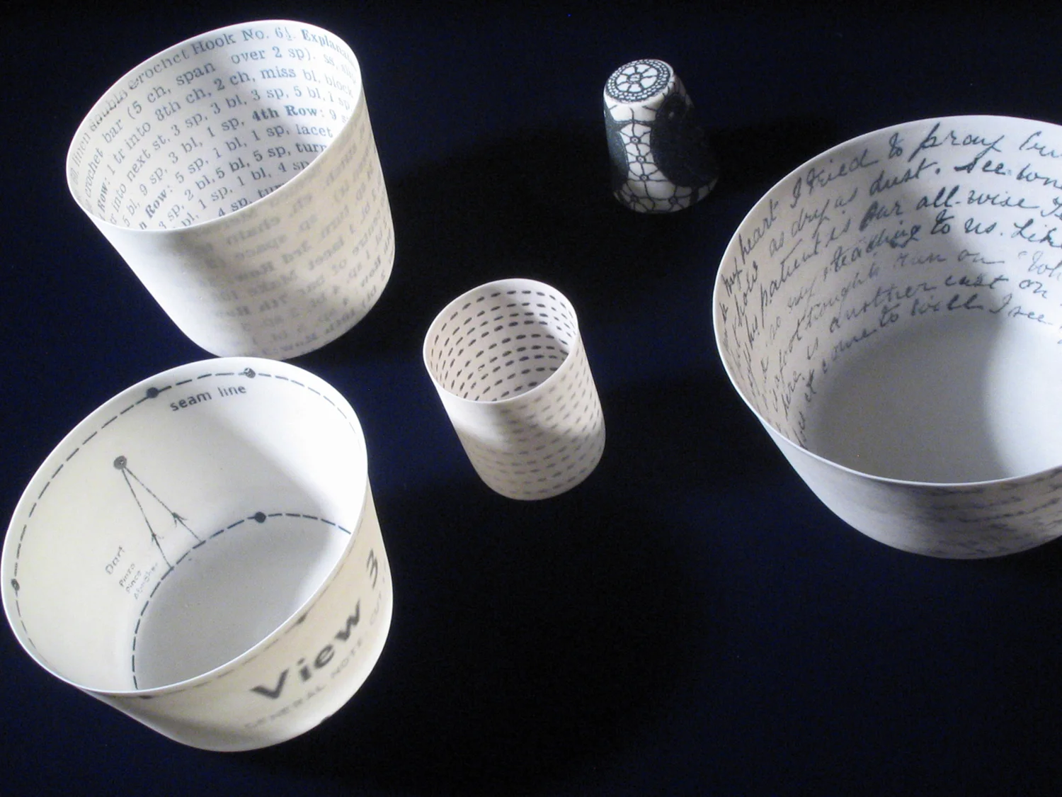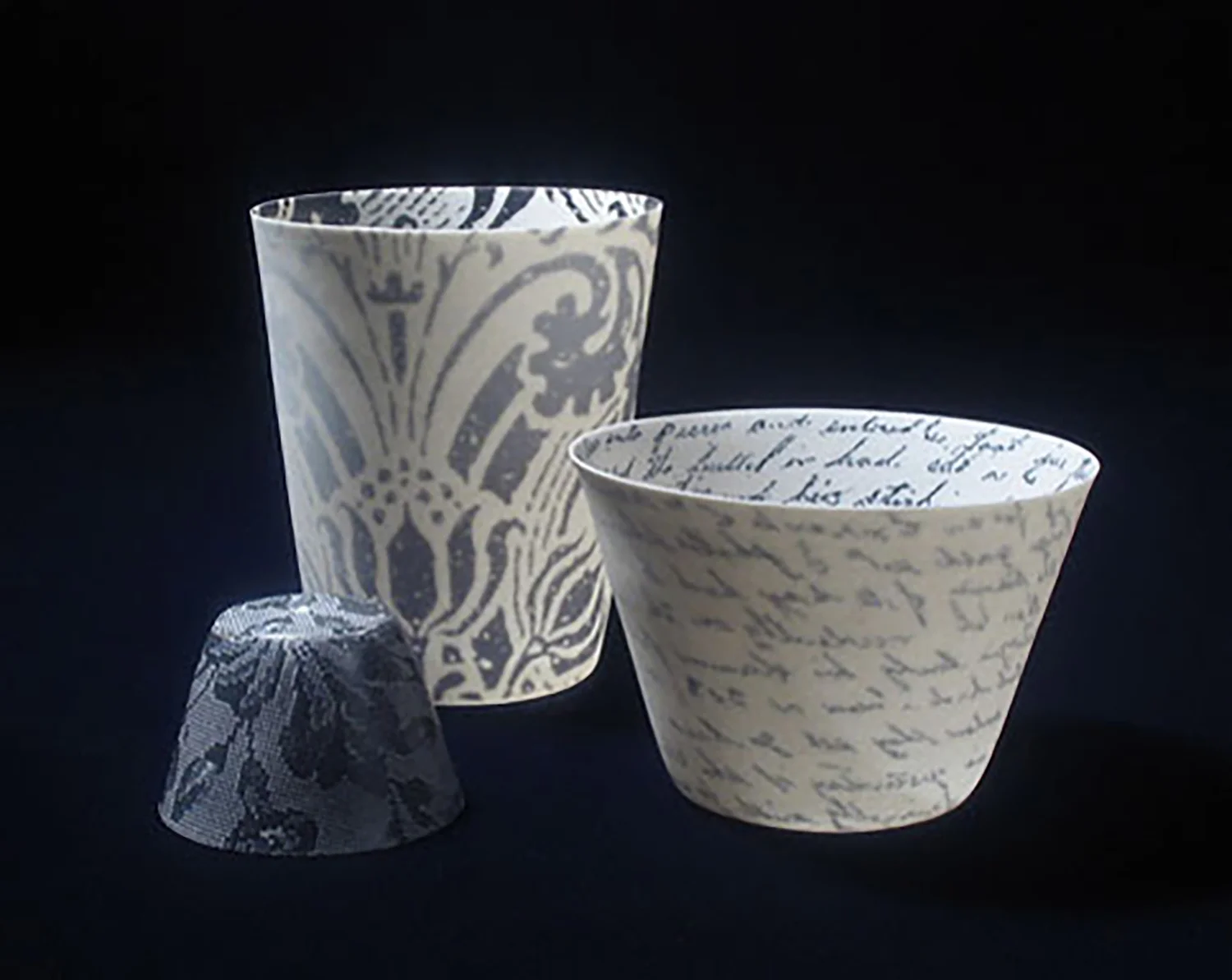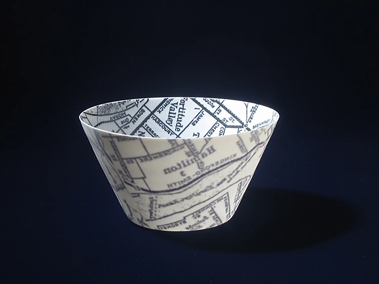 From 2005 until 2011 Mel Robson worked on a series of translucent porcelain works that evolved from an interest in the histories, stories and associations that can become embedded in everyday objects. They are responses to both her own past as well as the stories of a more collective history of the domestic. Imagery found in the domestic landscape such as old maps, family letters and diary excerpts, sewing patterns, recipes and photographs, are applied to the eggshell fine porcelain vessels. They reference the tenuous and fragile ways in which we can connect with the past and how we might discover and assemble meaning through objects.