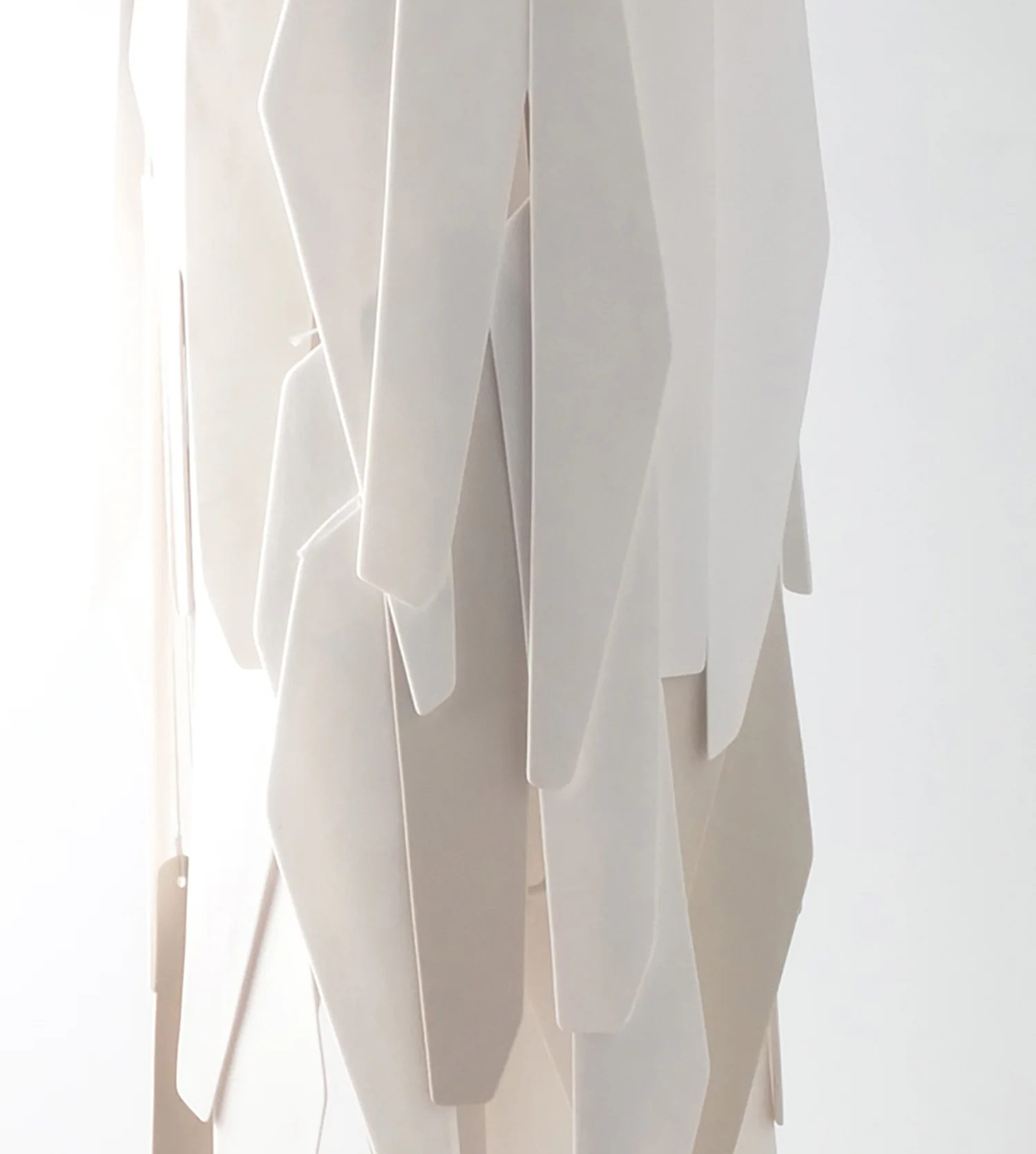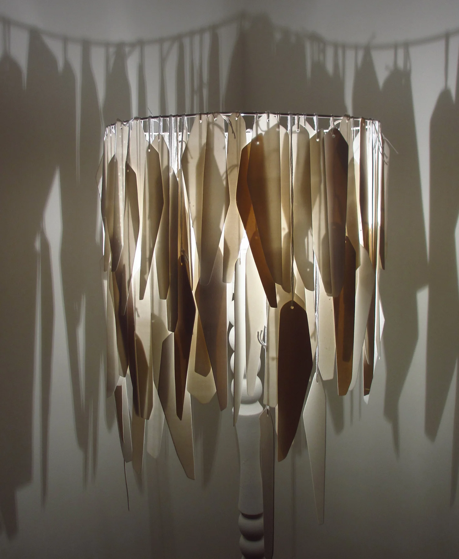 In 2013 Mel Robson and designer Elliat Rich collaborated to create a sculptural light installation and a series of vessels inspired by the denizen of the Central Australian bush, the Ghost Gum. Over 2000 wafer thin porcelain 'leaves' were used to create an ever-changing forest of light and shadow.
