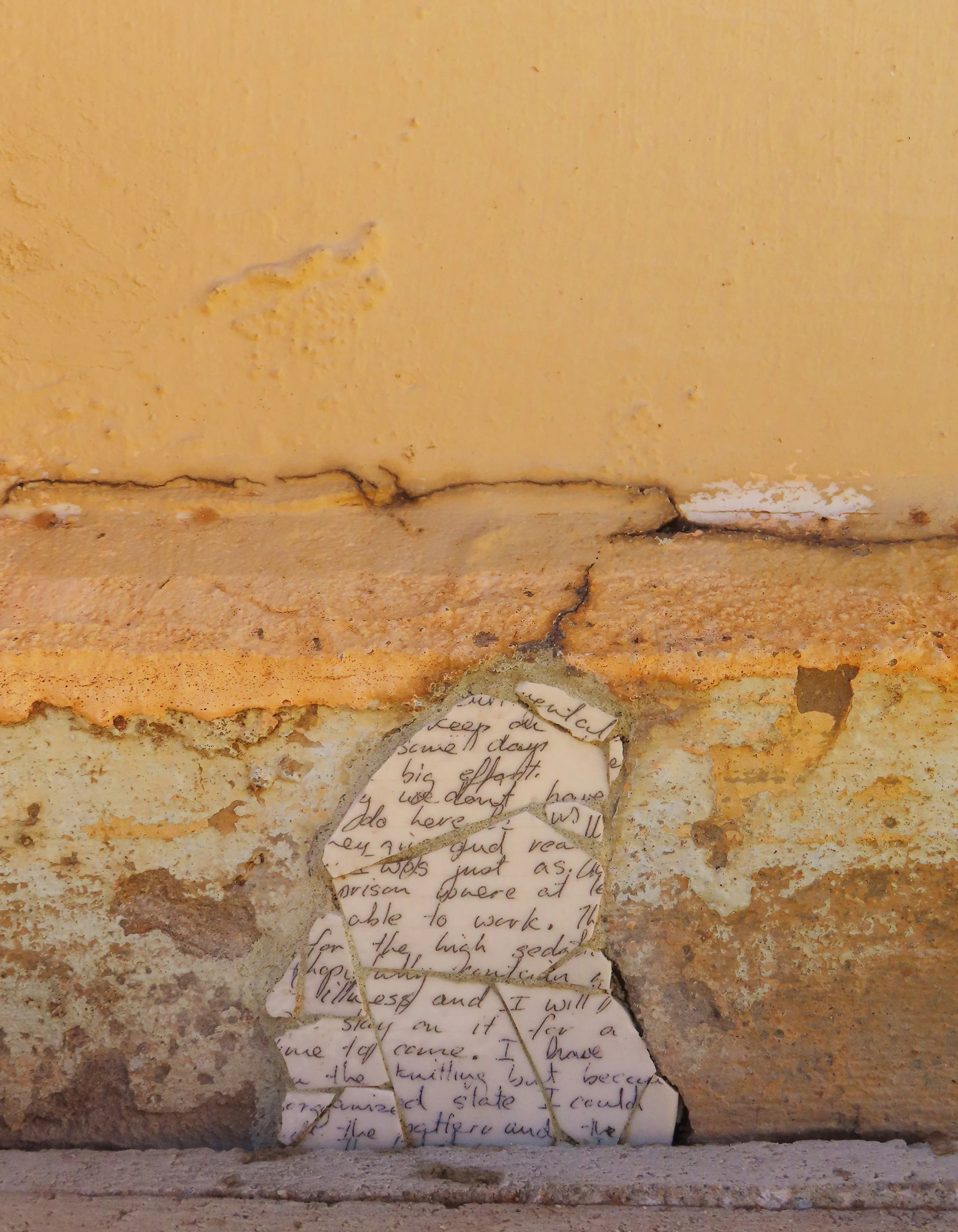 In 2019 Mel worked with the Womens Museum of Australia to create a site specific installation in response to the museum site and collection. Found ceramic objects, and imagery from the WMoA collection transferred onto ceramic tiles, have been embedded in the cracks and gaps in the walls and footpaths of the museum, creating brief glimpses of the past and fleeting traces of history. It aims to draw attention to the complexities of interpreting history, the way stories get remembered or forgotten amongst the dominant narrative, and the role objects can play not only in how we remember but also in how we forget.
